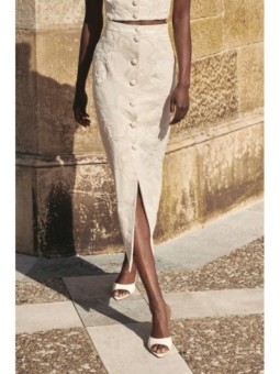 Falda confeccionada en un precioso tejido de lino en tono beige con dibujo en relieve al tono.